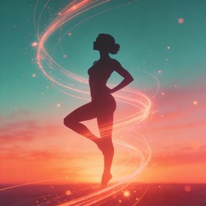 Silhouette of a woman in a yoga pose surrounded by swirling blue and green light, symbolizing relaxation and stress management related to body sculpting.